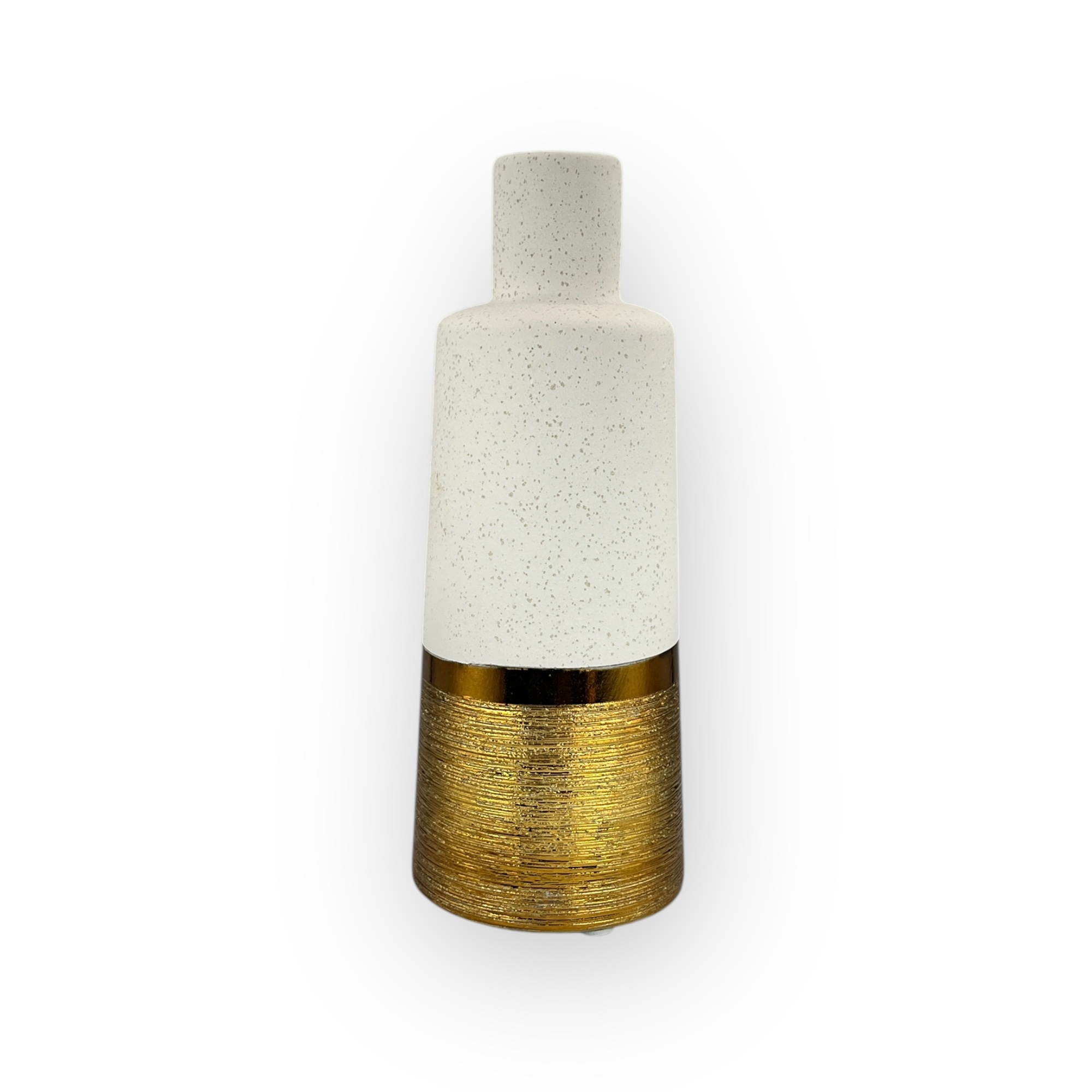Dodajte toplinu i suvremeni stil svom domu s ovom elegantnom keramičkom vazom, koja se ističe skladnim kontrastom boja i tekstura. Donji dio vaze u brončanoj boji donosi dašak luksuza, dok je gornji dio izrađen u nijansi bijele boje pijeska, obogaćen suptilnom pjeskastom teksturom koja unosi prirodan i umirujući osjećaj.